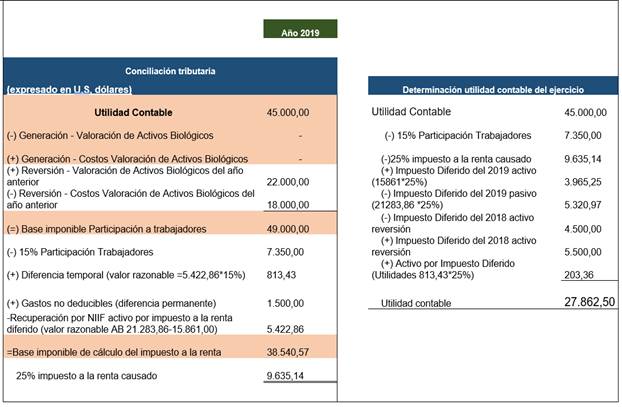 La conciliación tributaria establece en el ejemplo una utilidad de 45.000,00 incluida la valoración de activos biológicos por 21.283,36, se agrega la reversión por ingresos y costos del año 2018, por lo que se genera la base de cálculo de participación a trabajadores de 49.000,00, se aplica el 15% a fin de obtener la participación. A la base antes mencionada se les resta la participación a trabajadores, se resta el resultado entre los ingresos por generación y los gastos por diferidos, se adiciona los gastos no deducibles y se genera la base del impuesto a la renta con una tarifa impositiva del 25%. (ver figura 10), se exponen a continuación: