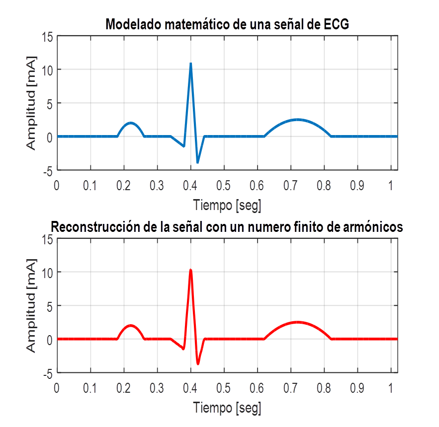 Al observar el gráfico de algoritmo de un ECG sin patología creado un número finito de armónicos se observa que está formado por ondas cuadráticas y triangulares mostrando de izquierda a derecha la onda P, complejo QRS y la onda T ideales.