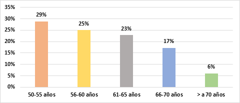 Dentro del gráfico 2, se observa que el 29% de las personas que presentan mayor incidencia de diabetes mellitus tipo II, bordean una edad de entre los 50-55 años, seguido por un 25% de personas que van desde los 56 hasta los 60 años, mientras que el 23% se encuentra establecido entre los 61 a los 65 años, el 17% entre personas que van desde los 66 a los 70 años de edad, y la menor incidencia se centra en personas que superan los 70 años con tan solo el 6% del total de la población estudiada.