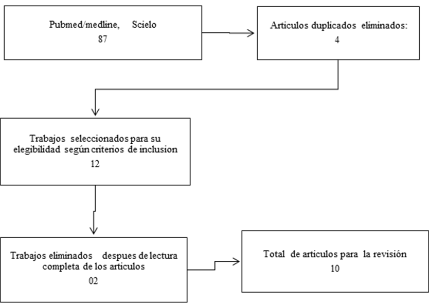 El proceso de búsqueda y selección de los artículos se muestra en la figura 1 del diagrama de flujo Prisma. De los 10 artículos seleccionados finalmente para la revisión; 6 correspondieron a estudios experimentales aleatorios controlados (ECCA) por sus siglas en inglés y 4 a estudios observacionales, transversales.