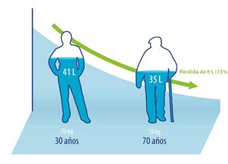 agua va disminuyendo, llegando a un 60% en hombres y 50% en mujeres de edad