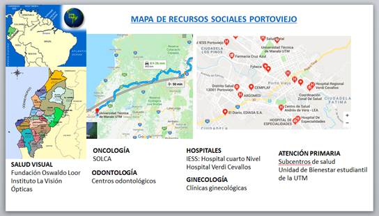 La Universidad Técnica de Manabí tiene entre sus objetivos fundamentales trabajar en conjunto con instituciones del sector externo en la prevención, promoción y análisis de las patologías más incidentes en nuestra comunidad. Es por esto que a continuación se detalla mapa de recursos sociales, asociaciones de pacientes, ONGs, Servicios Comunitarios y prestaciones sociales en bienestar de la comunidad manabita.