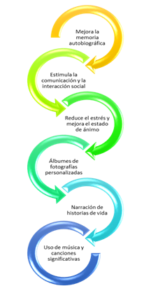 La Terapia de reminiscencia: Consiste en la revisión sistemática de los eventos y experiencias pasadas de los pacientes utilizando fotografías, música, objetos y otros estímulos que faciliten la evocación de recuerdos.