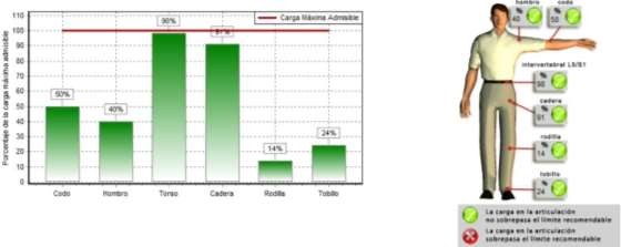 Con el uso de una cama de paciente ajustable y al reducir un 18,57 % el peso de la carga máxima para mujer en el puesto de trabajo de Auxiliar de enfermería y con ángulos de: 130° para rodilla, 94° cadera, 50° para L5/S1, 40° para hombro, 130° para codo, 90°muñeca se redujo las cargas máximas de: codo, hombro, rodilla y tobillo a los límites recomendados quedando: lumbar 122% y cadera con un 151% sobre el límite recomendado. Por otro lado, con el uso de una cama de paciente ajustable y al reducir un 18,57 % el peso de la carga máxima para hombre en el puesto de trabajo de Auxiliar de enfermería y con ángulos de: 130° para rodilla, 94° cadera, 50° para L5/S1, 40° para hombro, 130° para codo, 90°muñeca se redujo las cargas máximas de: codo, hombro, rodilla, tobillo lumbar y cadera a los límites recomendados.