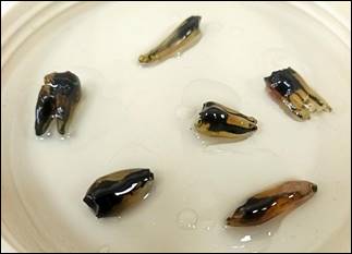 Figura 2. Piezas dentales en hipoclorito de Sodio al 5,25%.