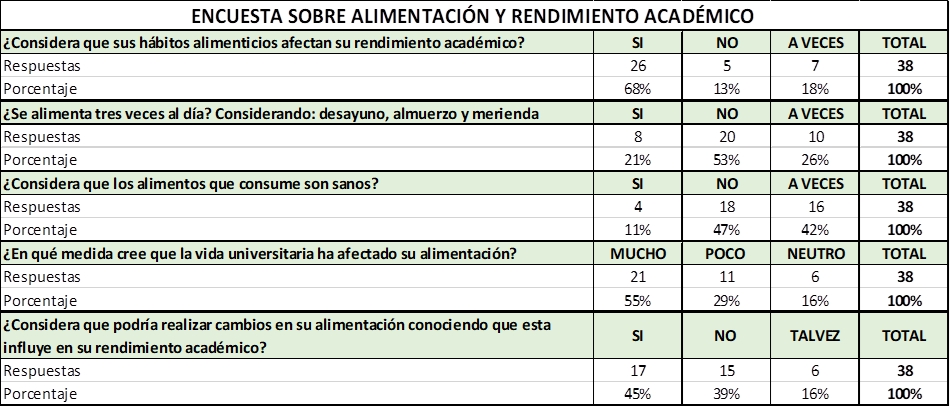 Los hábitos alimenticios de los estudiantes universitarios están caracterizados por constituirse de alimentos pocos nutritivos y llenos de grasas saturadas.  Por esta razón, el rendimiento académico del mismo se ve condicionado generando una falta de concentración, fallos en la memoria y cansancio físico. Si bien el rendimiento académico no puede ser asociado únicamente con los hábitos alimentarios como variables que lo determinan (factores institucionales, pedagógicos, psicosociales y sociodemográficos tienen también enorme relevancia al respecto), se ha comprobado que las costumbres inciden en la nutrición de los estudiantes y, por tanto, en el desempeño académico de estos. 8 9 10