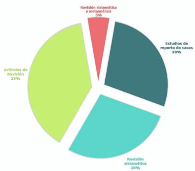 En esta revisión se consideró que los estudios de reporte de un caso representaron el 28%, revisión sistemática 28%, articulo de revisión 39%, y con menor porcentaje revisión sistemática y metaanálisis 5%.