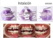 Plan de tratamiento: Debido a todo lo expuesto se decidió colocar un aparato de avance mandibular tipo monoblock para recapturar el disco. Para ello se inició con la realización de una mordida constructiva para la confección del aparato, se llevó a una coincidencia de las líneas media y un adelantamiento mandibular de 3 mm (Figuras D, E y F). Posteriormente se envió los registros para la confección del dispositivo de avance mandibular tipo monoblock (Klammt Clase II) que fue instalado en marzo del 2023 constatando de que se encuentre totalmente adaptado (G), las indicaciones de uso fueron más de 20 horas al día aconsejando que la paciente se lo retire únicamente para comer y para el aseo respectivo. Los controles se realizaron a las 2 semanas y después con una frecuencia mensual durante 12 meses.