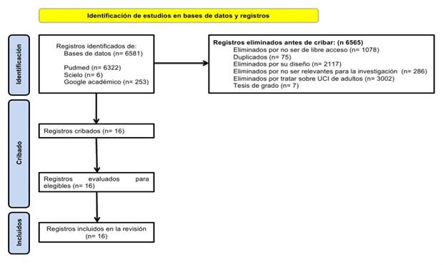 Siguiendo la estrategia de búsqueda descrita se identificaron 6581 artículos elegibles, de los cuales, se eliminaron 1078 por no ser de acceso libre, 75 duplicados, 2117 por su diseño, 286 por no ser relevantes para el tema de estudio, 3002 por tratarse de UCI para adultos y 7 tesis de grado. Al finalizar, quedaron 16 artículos, que cumplieron con los criterios de inclusión y exclusión, por lo que fueron incluidos en la revisión. En la figura 1 se muestra el Diagrama PRISMA de selección de los artículos.