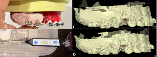 Figura 1. A. Tipodonto de cera con ansa helicoidal de aleación de NiTi en espacio simulado de extracción. B. Termómetro digital utilizado para la vigilancia de la temperatura. C. Escaneo digital de tipodonto con ansa de NiTi en T1. D. Escaneo digital de tipodonto con ansa de NiTi en T2.