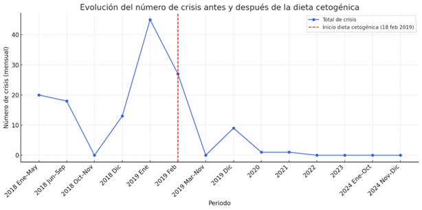 Figura 1. Evolución del número de crisis mensuales antes y después del inicio de la dieta cetogénica, 2018–2024.