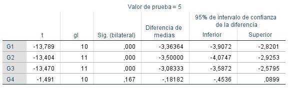 El G4 que corresponde al grupo experimental (recibió tratamiento) en momento pos prueba, posee significancia bilateral de ,167 mientras que el resto de los grupos permanecen en ,000 lo cual implica que el tratamiento aplicado surtió efectos positivos en la población que lo recibió, por lo cual se procede a la prueba de hipótesis: