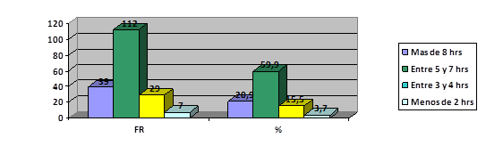En la tabla y grafico 10, se evidenció que el 59,9% de los estudiantes investigados coincidieron en opinar que duermen más de 8 horas diarias y el 20,9% indico que dormían entre 5 a 7 horas diarias. ¨Por otra parte se indica que el 15,5% solían dormir entre 3 y 4 horas. En menor proporción señalo con solo el 3,7% que dormían menos de dos horas.